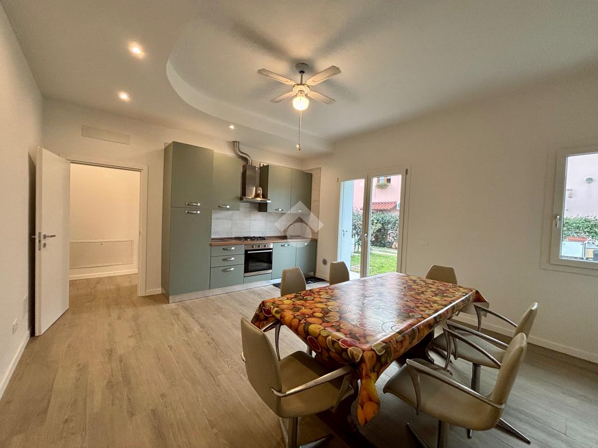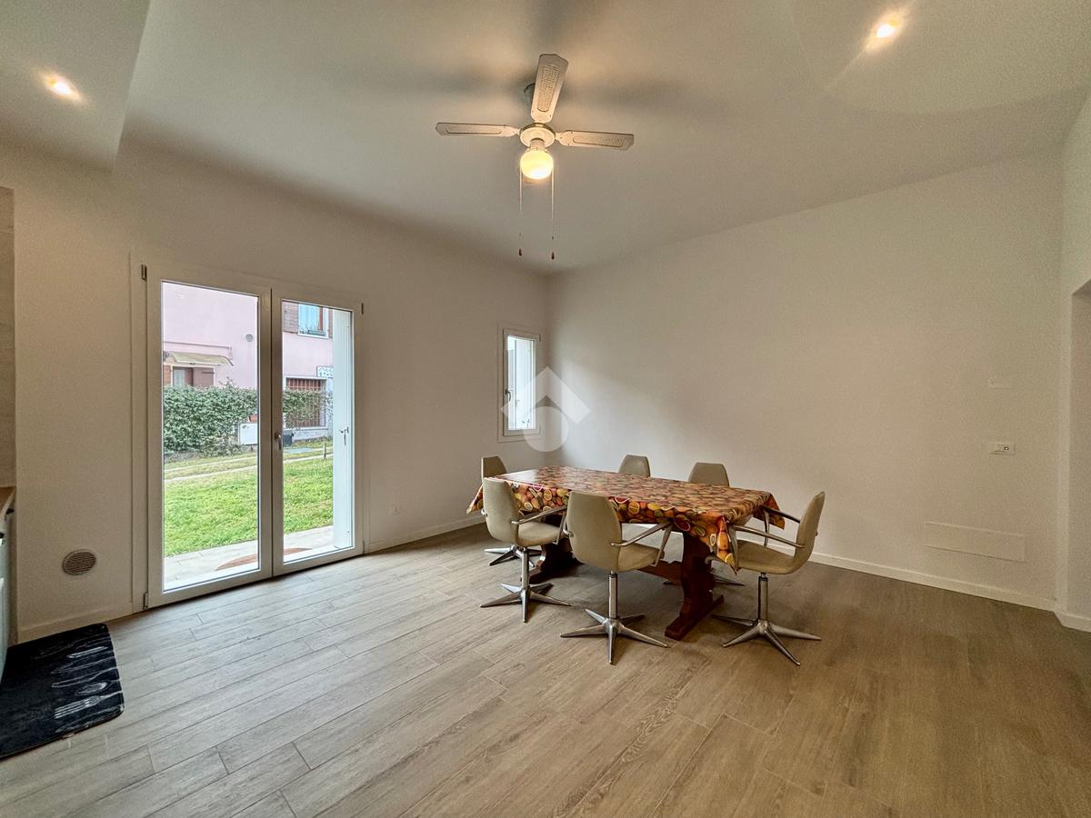 Al piano terra è presente un luminoso soggiorno con cucina separata che affaccia direttamente sul giardino privato ideale per trascorrere del tempo di convivialità all'aria aperta e completa il piano un pratico servizio finestrato.