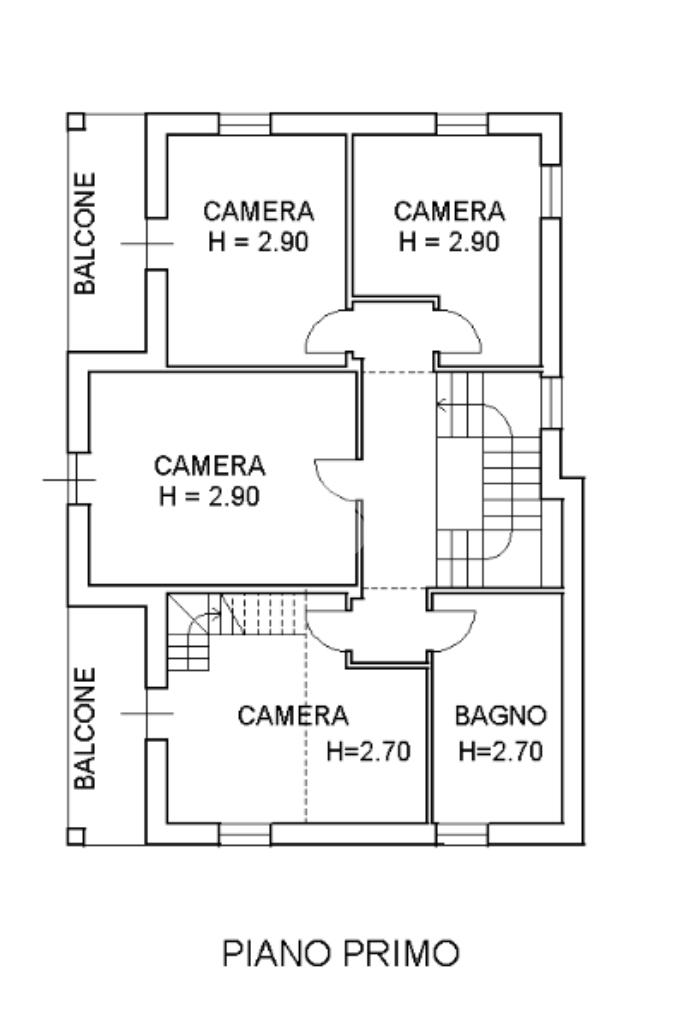 Salendo al piano primo troviamo quattro camere da letto di cui una camera matrimoniale soppalcata con accesso sul terrazzo, altre due camere matrimoniali una delle quali sempre con accesso sul terrazzo e una camera singola adibita a studio. Completa il piano un secondo servizio finestrato.